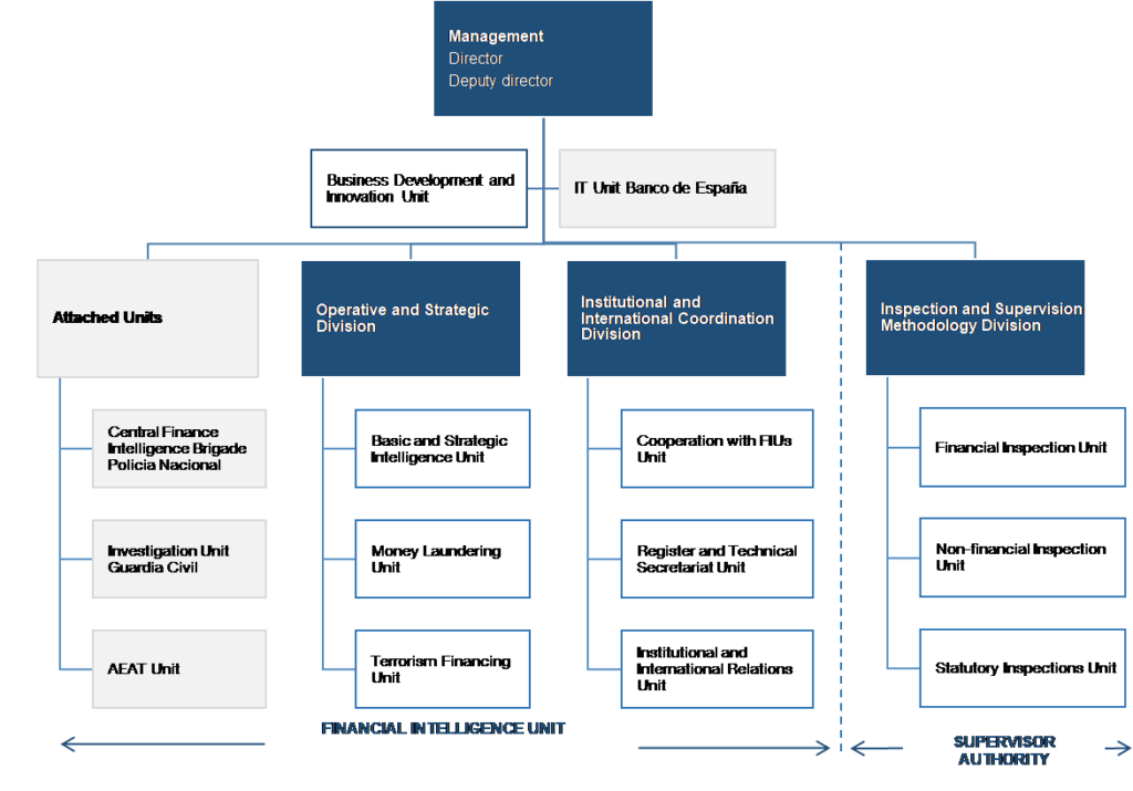 Additionally, three attached Units – the Central Financial Intelligence Brigade of Policia Nacional, the Investigation Unit of Guardia Civil, and the Unit of the State Tax Administration Agency (AEAT, by its initials in Spanish)- functionally report to the Management, that also receives technical support from the IT Services Unit of Banco de España.